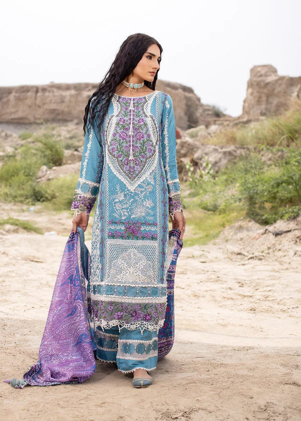 Elevate your wardrobe with this stunning Raw Silk 3-Piece Suit, designed for women who appreciate sophistication with a modern touch. Crafted entirely from luxurious Raw Silk, the outfit features finely detailed embroidery in soft lilac and ivory tones that beautifully enhance the refreshing teal-blue base.